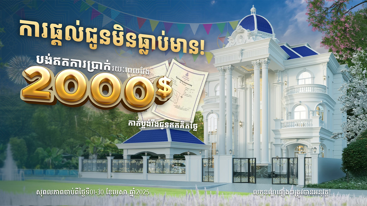 ក្នុងឱកាសនៃពិធីបុណ្យចូលឆ្នាំប្រពៃណីខ្មែរ ឆ្នាំ២០២៥ ខាងមុខនេះ បុរី វិមានសំណាង មានប្រម៉ូសិនពិសេសមិនធ្លាប់មាន ដែលផ្តល់ឲ្យអតិថិជនចំណេញលើសពីចំណេញ ជាពិសេសអតិថិជននឹងក្លាយជាម្ចាស់វីឡាទោលដ៏ប្រណិតបែបបារាំងភ្លាមៗ។