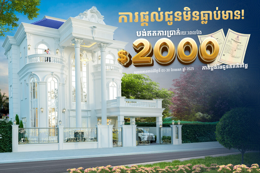 នៅក្នុងឱកាសពិធីបុណ្យចូលឆ្នាំប្រពៃណីខ្មែរខាងមុខនេះបុរី វិមានសំណាង និងរៀបចំកម្មវិធីប្រម៉ូសិនមិនធ្លាប់មានពីមុនមកជូនដល់អតិថិជន លោកអ្នកគ្រាន់តែបង់ត្រឹមតែ $2000 ឥតការប្រាក់រយៈពេល ២៤ខែ ហើយអ្វីដែលពិសេសថែមទៀតនោះមានការផ្ដល់ជូនការកាត់ប្លង់រឹង LMAP ជូនភ្លាមៗ។ បញ្ជាក់៖ កម្មវិធីដ៏ពិសេសនេះចាប់ពីថ្ងៃទី𝟏-𝟑𝟎 ខែមេសា ឆ្នាំ2025 តែប៉ុណ្ណោះ!