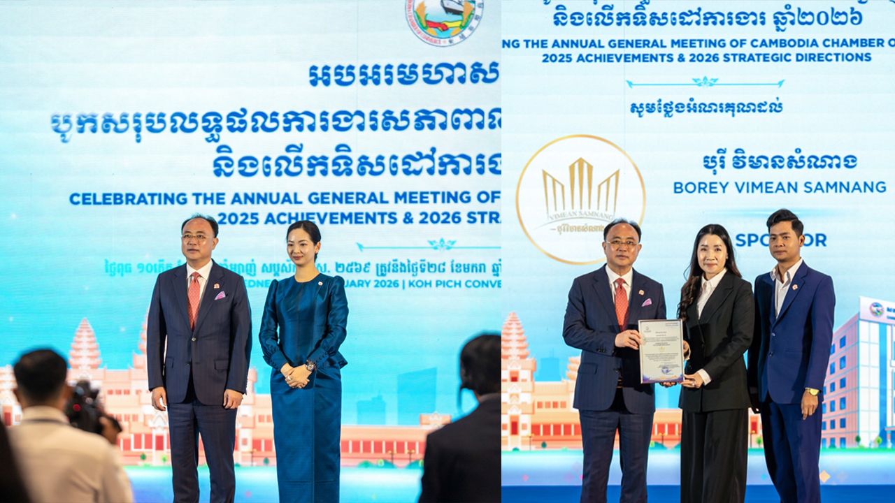 បុរី វិមានសំណាង មានកិត្តិយសដែលបានចូលរួមសហការឧបត្ថមនូវ កម្មវិធី «មហាសន្និបាតបូកសរុបលទ្ធផលការងារសភាពាណិជ្ជកម្មកម្ពុជាឆ្នាំ២០២៥ និងលើកទិសដៅការងារសភាពាណិជ្ជកម្មកម្ពុជាឆ្នាំ២០២៦» ក្រោមអធិបតីភាព លោកជំទាវ ចម និម្មល រដ្ឋមន្ត្រីក្រសួងពាណិជ្ជកម្ម និង អ្នកឧកញ៉ា គិត ម៉េង ប្រធានសភាពាណិជ្ជកម្មកម្ពុជា និងជាប្រធានក្រុមប្រឹក្សាពិគ្រោះយោបល់ធុរកិច្ចកម្ពុជា នាថ្ងៃពុធ ទី២៨ ខែមករា ឆ្នាំ២០២៦ នៅអគារមជ្ឈមណ្ឌលសន្និបាត និងពិពណ៌កោះពេជ្រ រាជធានីភ្នំពេញ។